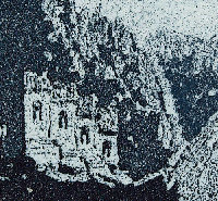 (petits formats - eau-forte au sucre) commencées par accident avec une première plaque de cuivre, restée dans l'acide. Je "m'attaque" à de tous petits formats. Cette série minuscule à été initiée par le travail de Marc Jurt graveur Suisse qui avait exposé à la galerie Michèle Broutta, je l'ai réalisé dans l'esprit d'un éphéméride voyageur . Travail introspectif, s'inspirant de l'esprit des architectures minuscules situées entre l' Espagne et Arménie, les deux extrêmes d'une Europe médiévale,héritière de l'antiquité, mais pas encore gothique. Mes voyages au Nord de l'Espagne,des monastères wisigothiques et mozarabes, aux alentours de Ravenne en italie, à la Sicile normande, en passant par les Météores en Grèce, la Cappadoce, et les ruines de la ville d’Ani en Turquie...en seront les sources essentielles.