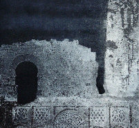 Premiers transferts, première série. Abandon du dessin première tentative Ne plus passer par le dessin, mais par la photographie, en insistant davantage sur la graphie. Pour cela j'ai sélectionné une série d'images, réalisée pendant notre voyage de 1987 en Espagne. Après un travail à la photocopieuse, je n'avais pas d'ordinateur à cette époque, j'ai transféré les résultats à travers un vernis sur des plaques de cuivre. Le transfert réalisé, je posais une aquatinte, pour accentuer l'aspect de la texture de l'image, m'éloignant du rendu trop clinique de l'héliogravure. Il s'agissait pour moi d'établir une distance avec la photographie. L'empreinte de l'image doit primer sur son identité scientifique ce qui ressort quasi continuellement à travers la photographie actuelle au point de n'être plus que l'illustration d'un concept, n'existant plus en soi. la matière à la parole Depuis cette période, je m'attache à ce qu'aucune de mes images ne soit exclusivement conceptuelle, mais issue d'un travail d'expériences. avec ses erreurs, ses approximations. C'est aussi pour cela que je considère la première "étude mudéjare" comme un nouvel état d'esprit. Une sorte de libération d'un excès de maîtrise.