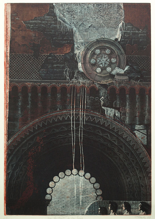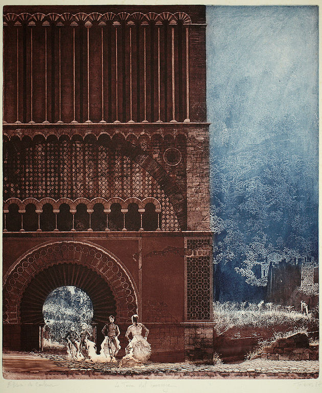 "La Torre del Homenaje" - 66 cm x 56 cm eau forte sur Zinc - Techniques mixtes (verni mou - stencil a alcool - aérographie - pointe sèche) 1987 |